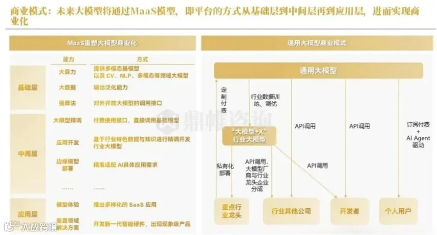 未来大模型将通过 MaaS 模型,即平台的方式从基础层到中间层再到应用层,进而实现商业化。