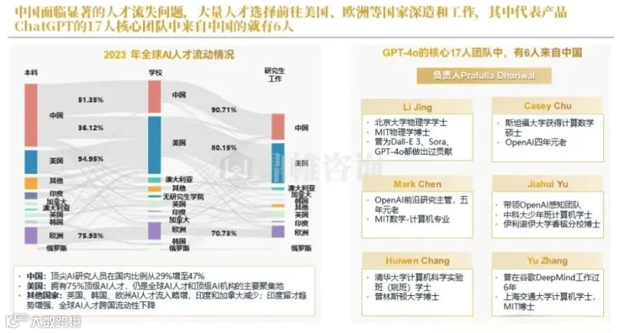 此外,中国其实还有比较严重的人才流失,大量人才选择前往美国等国家深造和工作。其中 ChatGPT 产品的 17 人核心团队中,来自中国的就有 6 人。