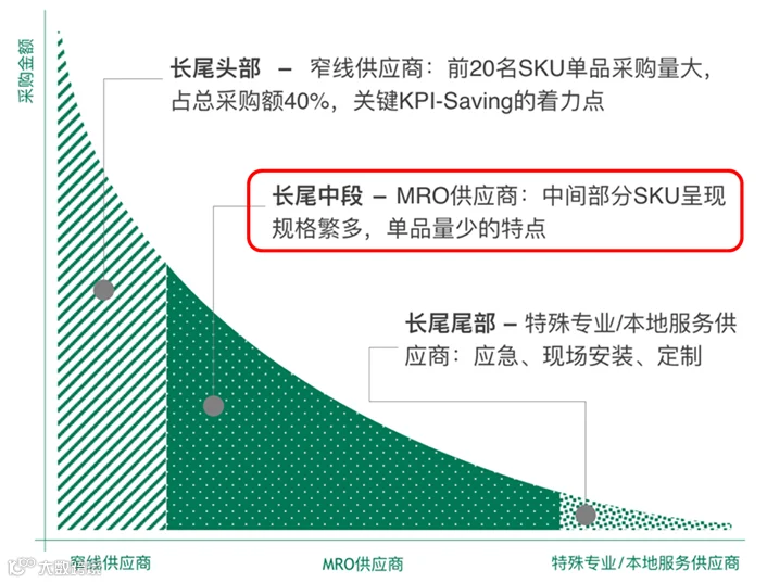 一提到MRO,大家就联想到长尾。但长尾还可细分,就如图2所示,长尾头部的单品采购量大,采购金额高,对企业的影响大,是采购节支的重要对象,可由企业自己来采购。长尾的中段呢,对企业来说是典型的量小货杂,但对MRO供应商来说则否。后者聚合多个客户的需求,形成规模效益,对企业来说是“收口子”的理想对象。把MRO供应商选好、管好,对企业的总成本往往更低。