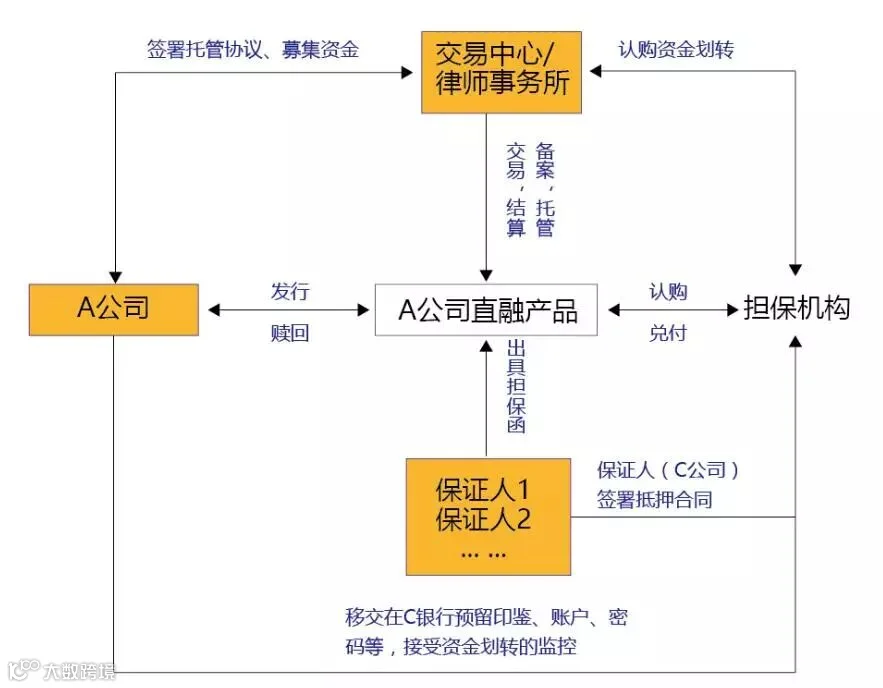 这家担保机构快速接入,对企业进行尽职调查,综合考虑各方面因素后,联合一家具备发行企业债券的金融资产交易平台公司(简称“交易中心”)一起操作,操作方式为:由A公司通过交易中心发行直接债务融资产品(产品名称“A公司直融1期”),其中交易中心会同律师事务所完成备案、登记、结算、托管等工作,担保机构以自有资金购买该产品,并由三方具体确定风险控制方案,具体交易模型如下: