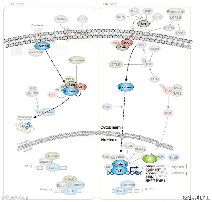 当「β-catenin 降解复合物」被抑制后,胞浆内的 β-catenin 得以稳定存在,部分 β-catenin 进入细胞核与 TCF/LEF 转录因子家族作用并促进特定基因的表达。