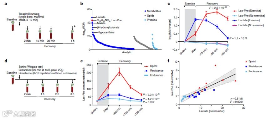 首先,研究人员对剧烈跑步运动的小鼠血浆进行代谢组学分析,发现代谢物N-乳酰苯丙氨酸(Lac-Phe)含量显著升高,这种特殊的氨基酸是由乳酸和苯丙氨酸经代谢酶CNDP2催化生成,同时,Lac-Phe的合成和释放依赖于代谢酶CNDP2的活性以及代谢底物乳酸的含量,在赛马血浆样品代谢物检测中也获得了类似的结果,由此研究人员得出结论:运动可诱导Lac-Phe合成并释放入血。