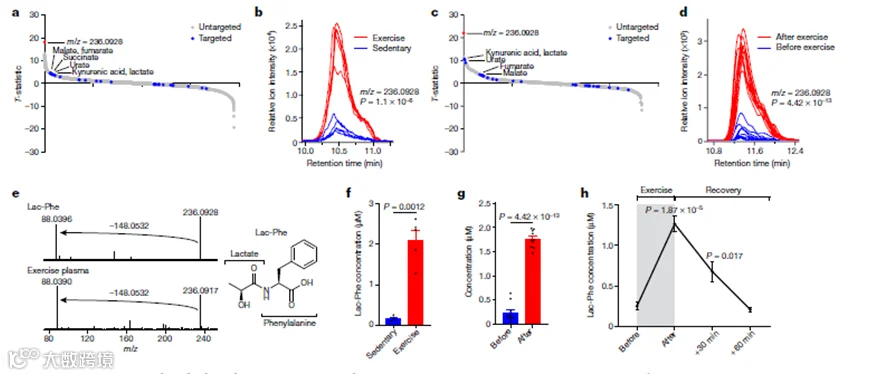 最后研究人员发现,在赛马和运动后的人血浆样本中同样检测到Lac-Phe含量显著升高,尤其是短跑运动后的血浆Lac-Phe增加最为明显,说明Lac-Phe也是哺乳动物运动相关的效应分子。
