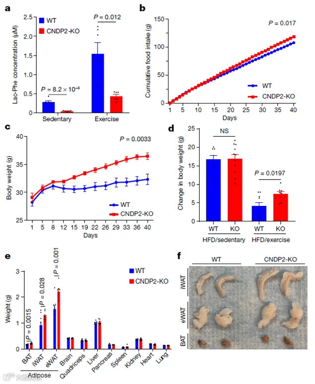 反向验证结果显示,降低小鼠体内Lac-Phe含量或者敲除CNDP2蛋白会导致食物摄入量增多以及运动后的肥胖,说明CNDP2活性或Lac-Phe确实在抑制小鼠肥胖中起关键性作用。