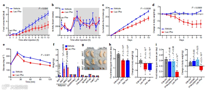 接着对Lac-Phe的生理作用进行了研究,在饮食诱导的肥胖小鼠模型中给予Lac-Phe发现,小鼠食物摄入量显著减少,但不影响运动及能量消耗。Lac-Phe处理10天后,小鼠的累积食物摄入量以及体重均显著降低,同时葡萄糖耐受得到明显改善,说明Lac-Phe的摄入可以抑制进食量控制体重并改善葡萄糖的平衡状态。