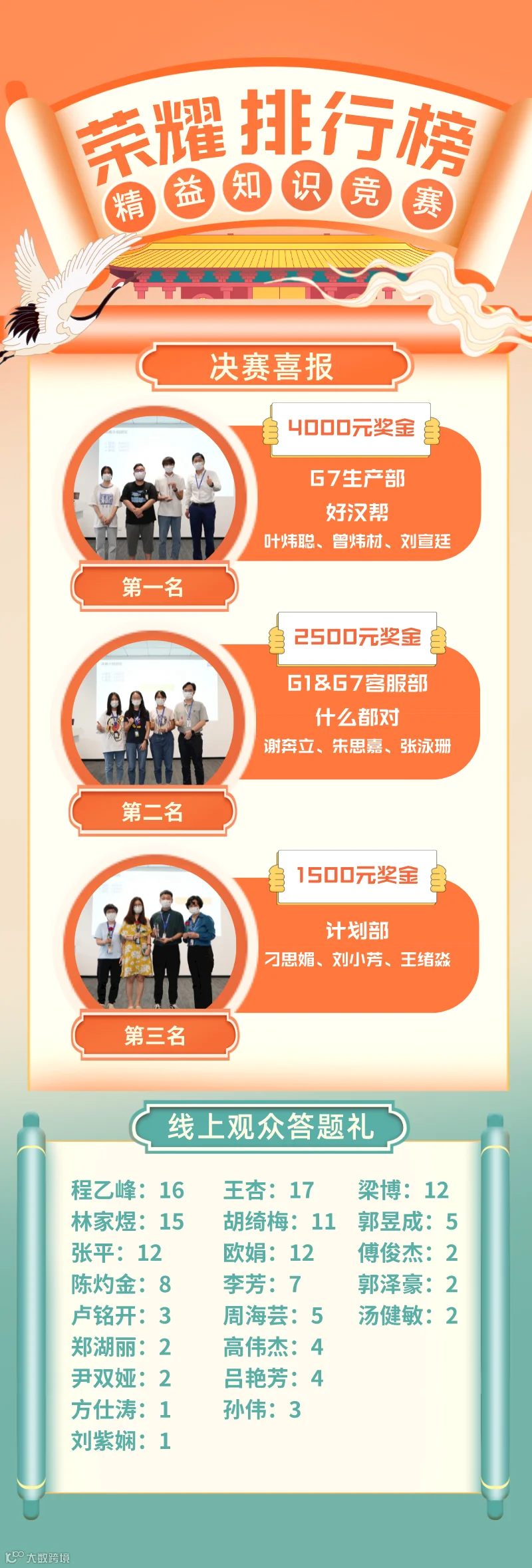 此次精益知识竞赛CNRx共有322人参与了为期2周的线上海选活动,经过角逐初选31人入围半决赛。其中G1有14人,G7有17人,分别来自生产部、自动化与智能化部门、物流部、质量保证部、工艺工程部、客服部、维修工程部、信息技术部、环境安全部、采购部等部门。