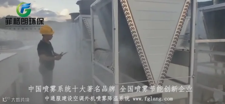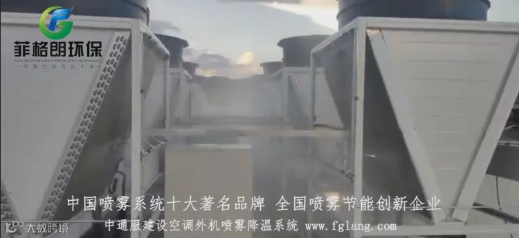 中央空调室外机降温可以很大的提高中央空调冷却系统的效率,延长压缩机的寿命,特别在炎热的夏季,我司采用中压两相流户外环境降温技术,采用水处理技术,不直接对着风冷冷凝器的换热部分(铜管铝翅片结构) 喷雾,有效避免产生腐蚀现象。通过精密喷嘴雾化,风送喷出无数微米级的雾滴弥漫在降温区域,这些水雾在蒸发的过程中,大量吸收周围空气中的热,从而使局部环境温度有效下降。这大大缓解中央空调机组的工作压力,从而大大减少了能源的使用,提高了空调机组的工作效率,延长了压缩机的寿命。