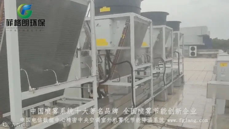中央空调室外机降温系统原理:通过高压水泵将水通过雾化喷嘴喷出,让水形成细小水雾颗粒,颗粒直径在20um以下,细微水雾产生较大的湿球面积,在高温下迅速蒸发吸热,从而达到降温效果。对于水质要求,我们会对水进行软化纯水处理,不会对空调冷凝器翅片造成任何损害。