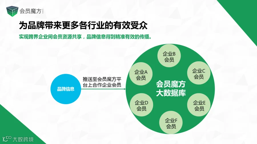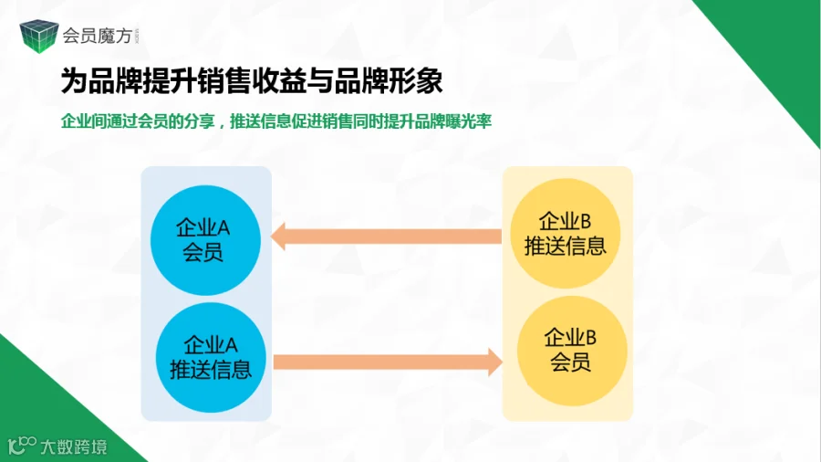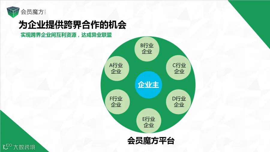 合——会员吸纳—平台内各大商家会员 / 粉丝共享:入驻的企业主通过平台可跨界寻求企业合作,将商品信息推送至合作企业的会员粉丝,实现商家会员/粉丝的共享。