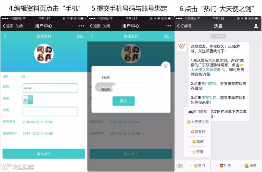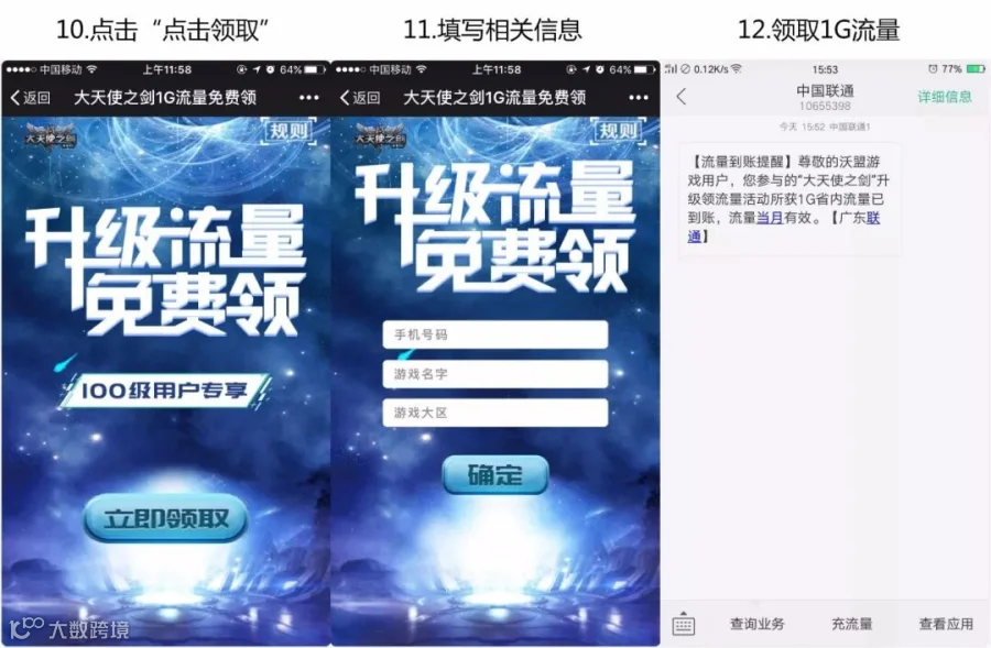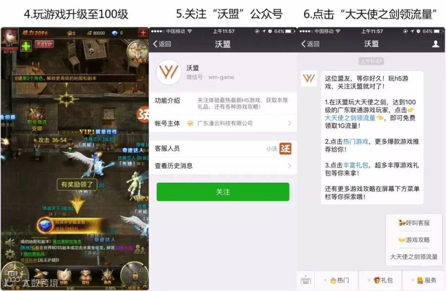 5.领取方式:100级后关注“沃盟”公众号(微信搜索“沃盟”),点击“服务-大天使之剑领流量-输入手机号码”即可领取。