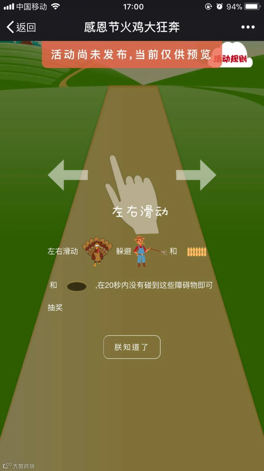 2、进入活动,参与感恩节火鸡H5,控制火鸡躲避障碍物,过关即可参与抽奖。