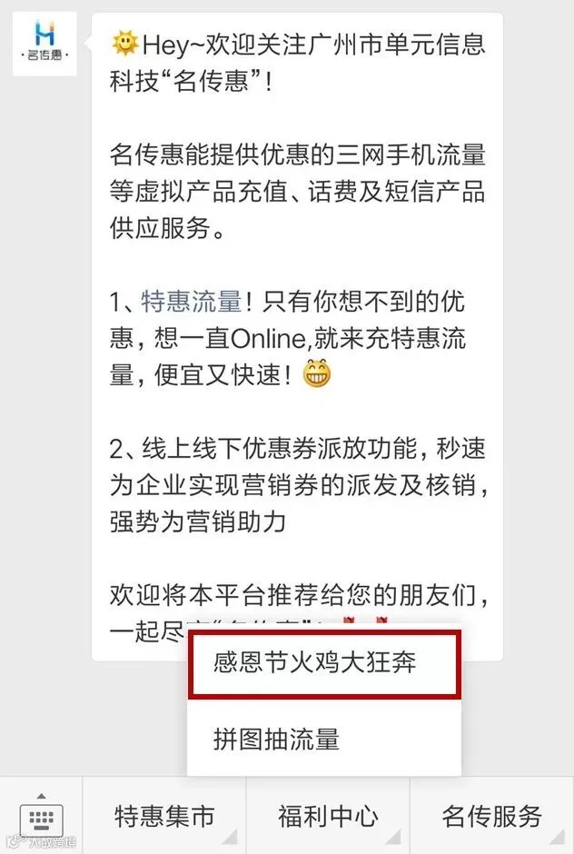 1、关注“名传惠”公众号,点击菜单栏进入“福利中心-感恩节火鸡大狂奔”