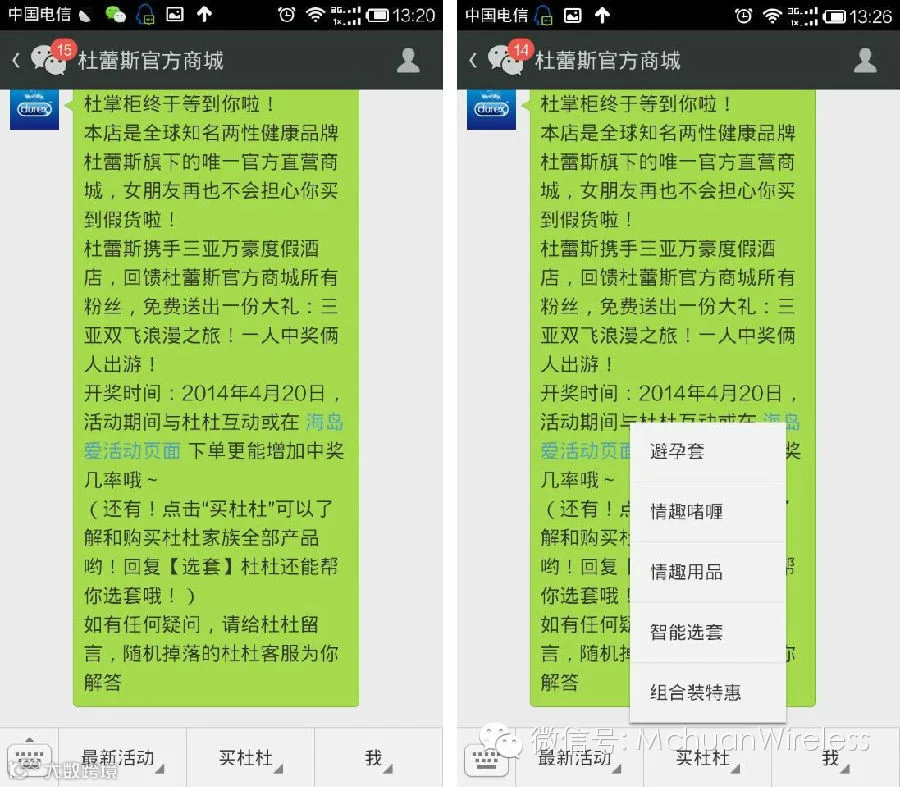 今年2月,杜蕾斯还推出了微信上的官方商城(服务号),人们可以直接在微信上下单购买产品,官方商城上还会定期推出产品促销活动。