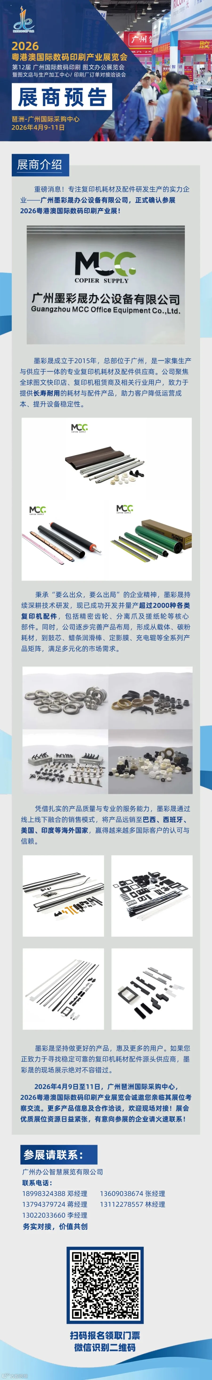 【展商播报】广州墨彩晟办公设备有限公司——复印机长寿耗材与配件专业供应商,确认参展!