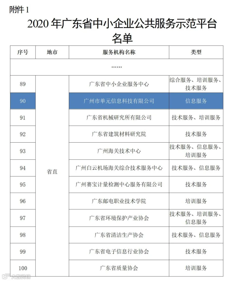 近日,广东省工业和信息化厅根据《广东省工业和信息化厅关于组织开展2020年省中小企业示范平台示范基地认定工作的通知》(便函〔2020〕2824号),经自愿申报、资格初审、专家评审、现场考察等程序,选出100个单位获评“2020年广东省中小企业公共服务示范平台”,其中广州市单元信息科技有限公司(名传无线)成功入选,是省直5家提供“信息服务”的公共服务示范平台之一。