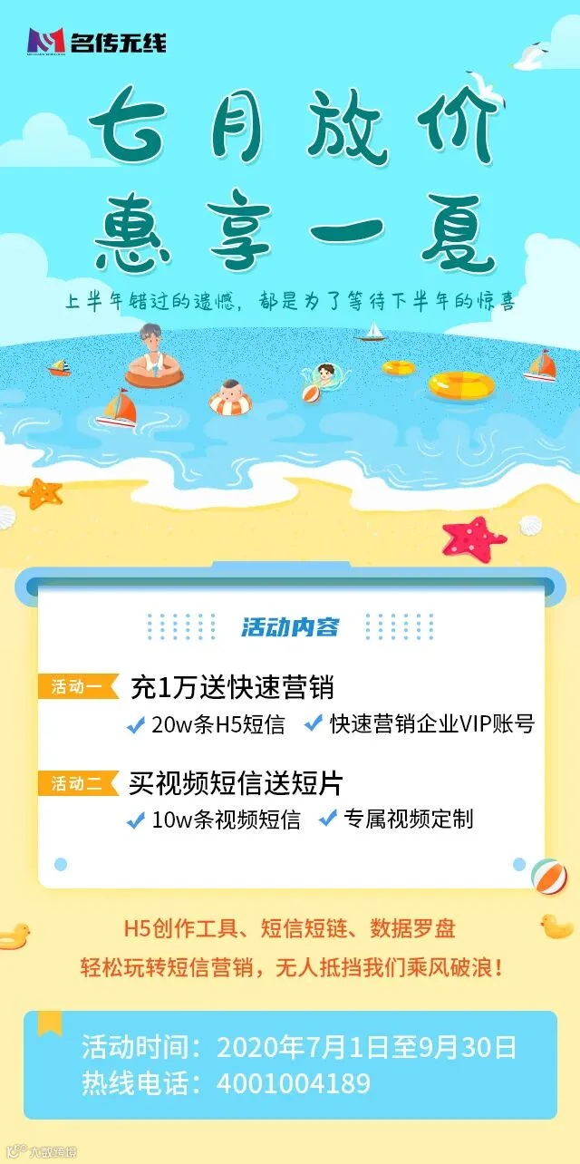 “七月放价,惠享一夏”, 名传无线H5短信充1万送快速营销VIP、 视频短信买10万条送视频制作服务优惠活动,在7月1号正式开始了。你还等什么,赶紧来了解一下!
