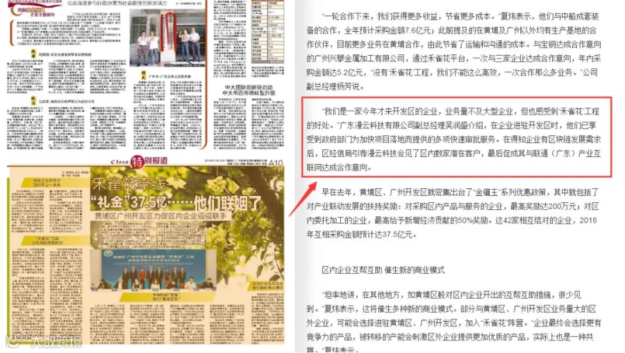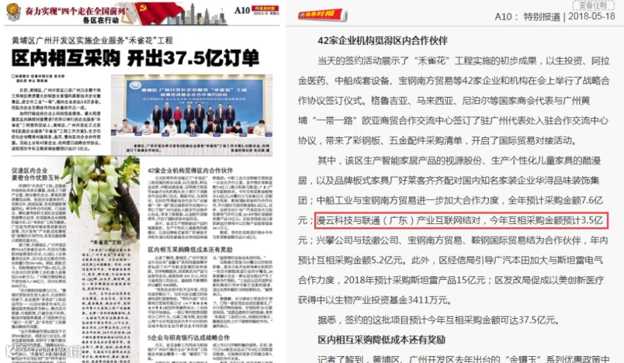 在黄埔区“禾雀花”工程的促动下,漫云科技与中国联通成功签署战略合作协议。漫云科技和中国联通接下来会在区块链、IDC、产业云、短信、话费等达成互相采购,会展开更深入合作,预计2018年累计采购金额达3.8亿元以上。