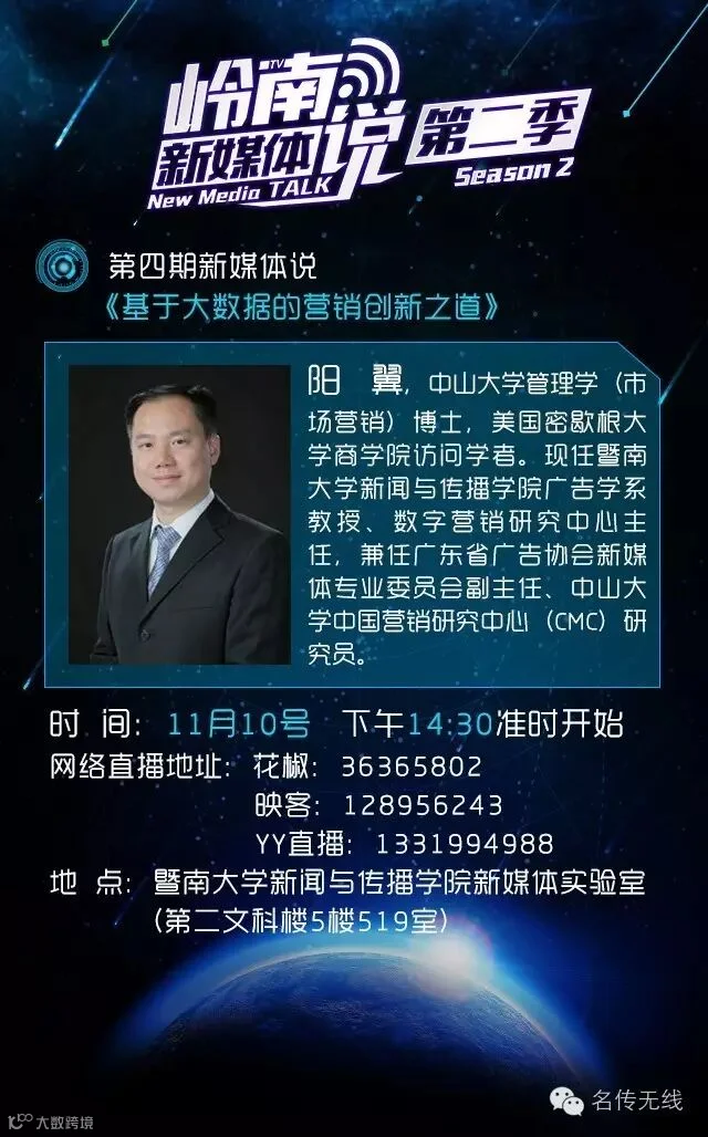 近几年来,大数据是个非常热门的话题,充分利用大数据也是未来营销领域的一个重要发展趋势。在11月10日下午,“岭南新媒体说”第二季第四期开讲,暨南大学新闻与传播学院阳翼教授为你讲解《基于大数据的营销创新之道》,对大数据、大数据营销等内容作了专业剖析。本期直播,同学们冒雨前来直播现场,热情高涨,现场座无虚席,线上吸引了共计36000多名网友到直播间进行交流互动。