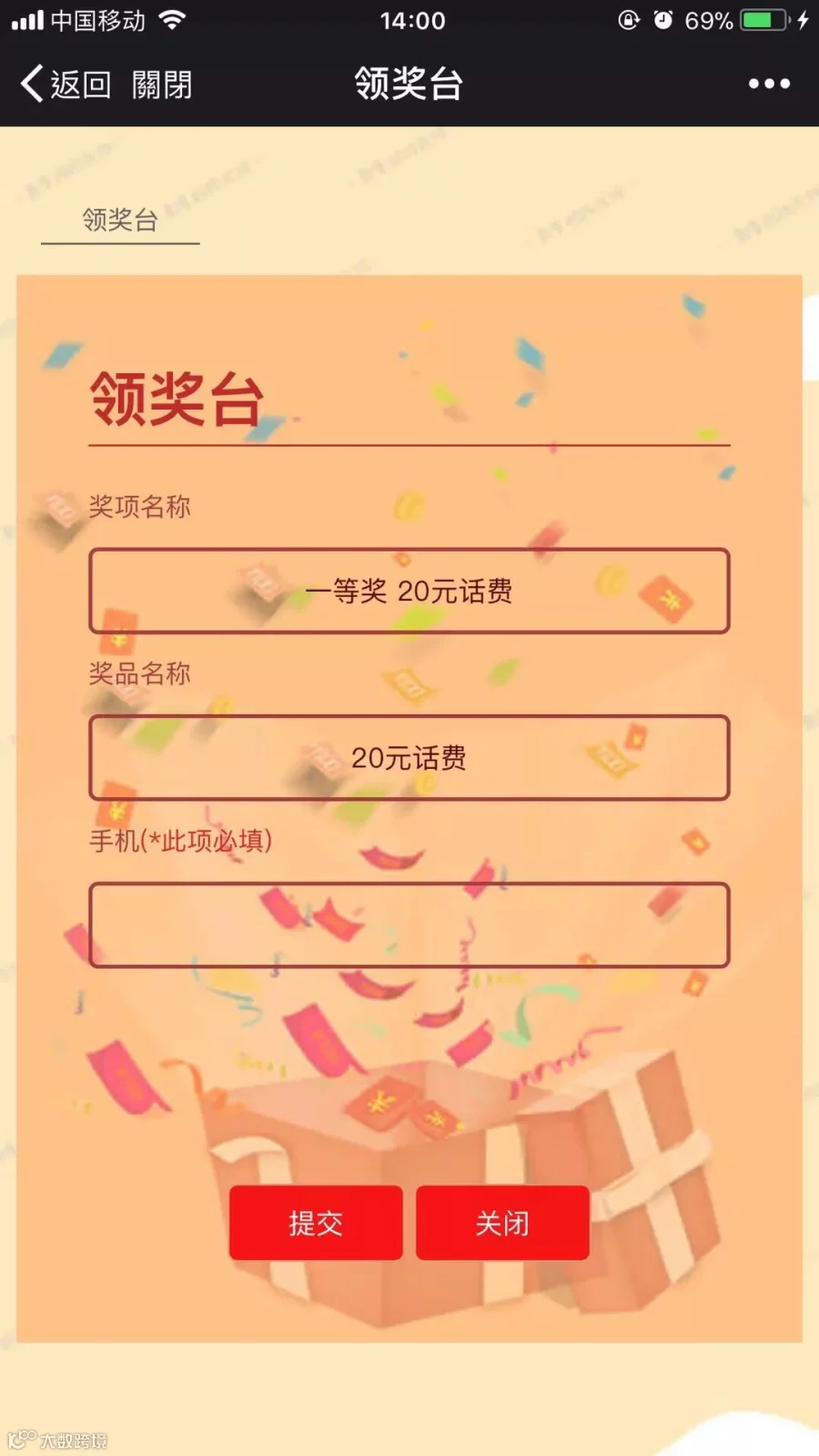 7.进入领奖台,输入领取话费用的手机号码后提交