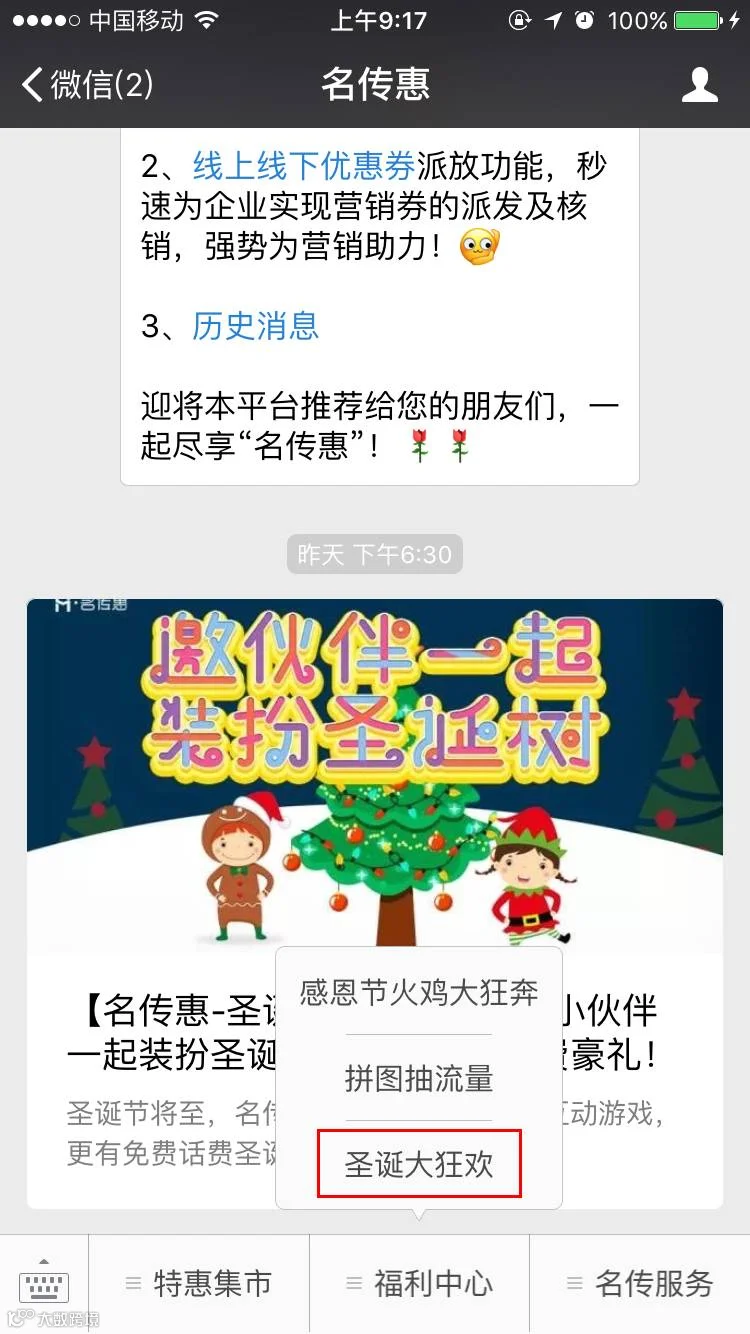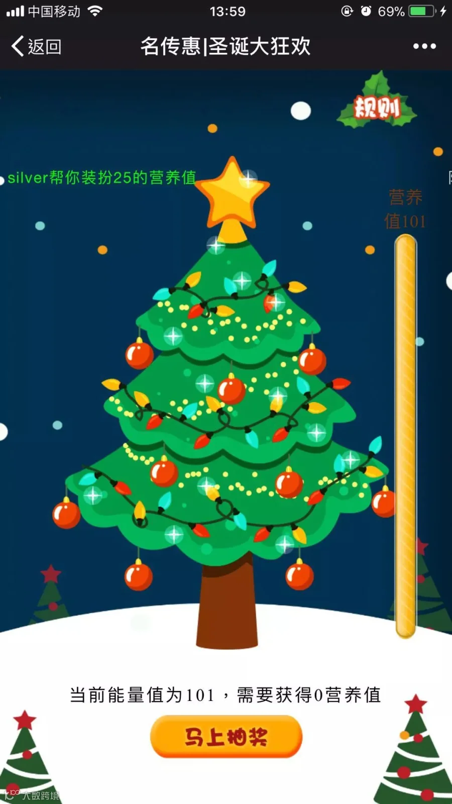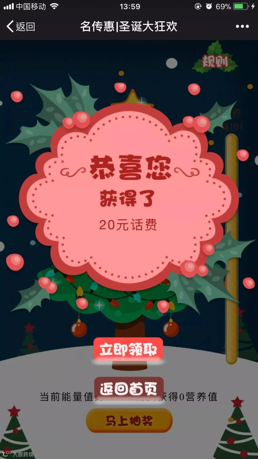 2.参与方式:关注“名传惠”公众号,进入游戏页面后,参与游戏邀请好友装饰圣诞树,每位好友成功装饰后,您的圣诞树即可获得相应的能量值,当能量值满100后,即可参加圣诞好礼抽奖。每个参与者活动期间共3次抽奖机会,有机会获得话费奖励。