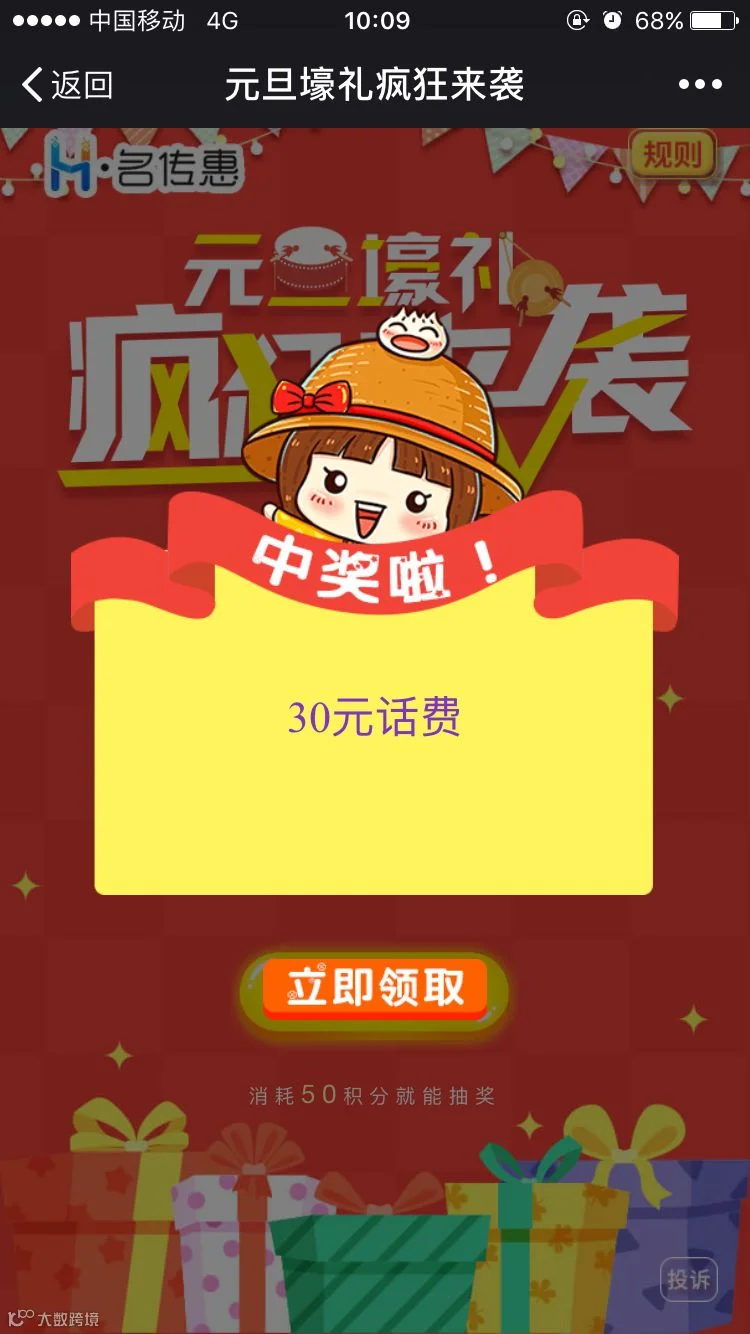 3.活动设有30元话费、10元话费、5元话费、100M流量、50M流量、10M流量共六个奖项。