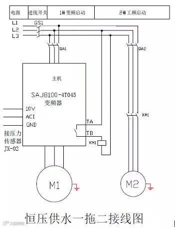三晶电气为了减少一拖二系统的成本,在水务控制器上增加一拖二模式;不用两台控制器,不用外加恒压供水控制器,只要一台控制器和外加一个接触器,就可以实现一拖二的功能,就是这样简单。系统实现接线如图示: