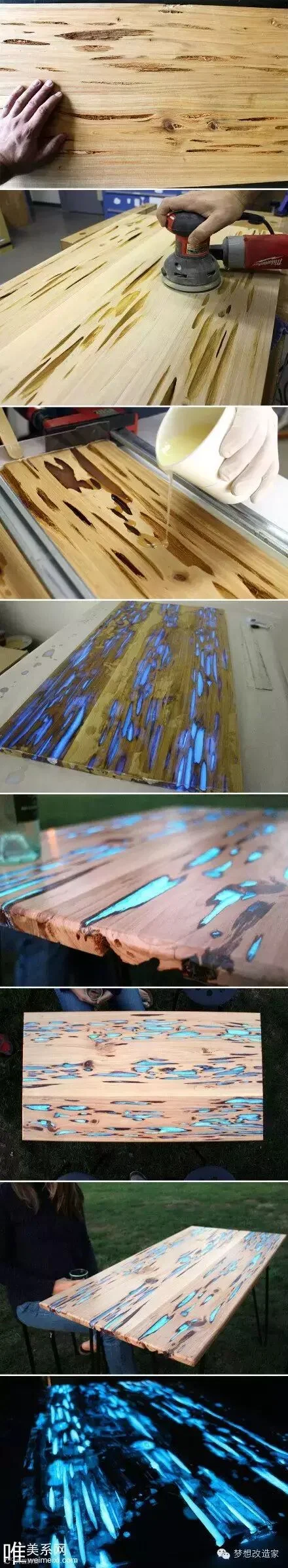 这种荧光效果是利用荧光树脂和木材本身的一些空洞和不完整的瑕疵进行结合,既抚平了残缺又创造出夜晚会发出荧光的唯美效果。一举两得。