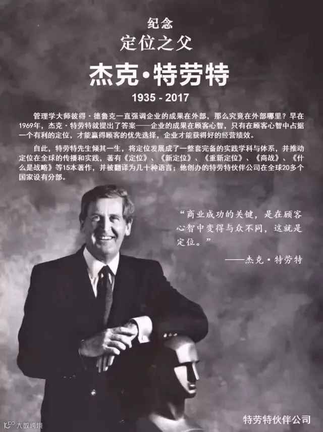 1996年,特劳特推出了定位论刷新之作《新定位》。2001年,定位理论压倒菲利普·科特勒、迈克尔·波特,被美国营销学会评为"有史以来对美国营销影响最大的观念"。2009年,他推出了定位论落定之作《重新定位》。