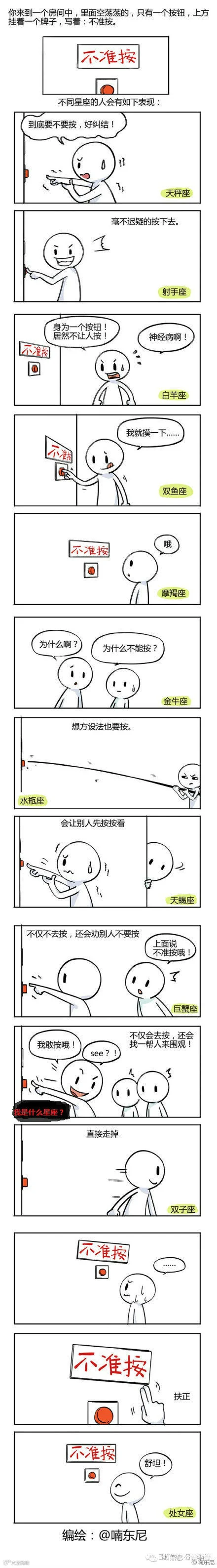 据说当十二星座来到一间空荡荡的房间,里面只有一个按钮,按钮上方写着“不准按”,他们会有如上反应.