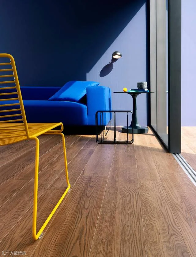 高纯度绿色衬托下的木纹砖,沉静而又充满生机。