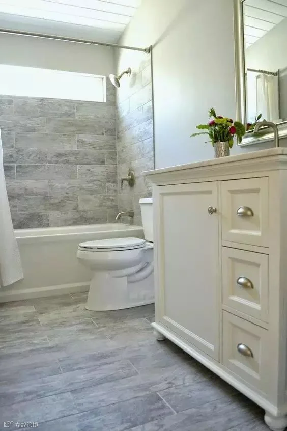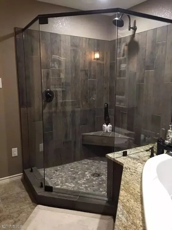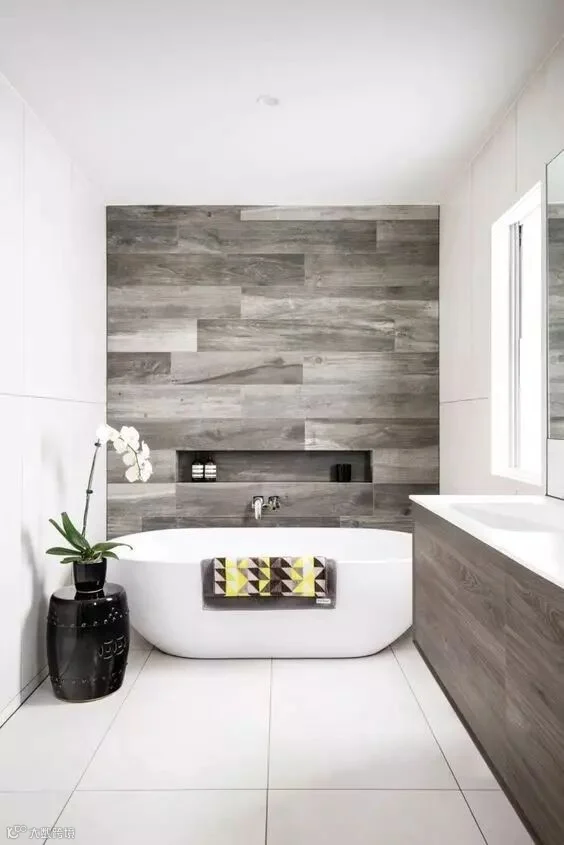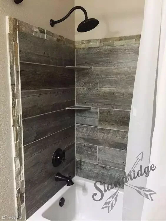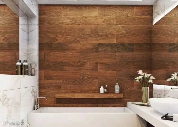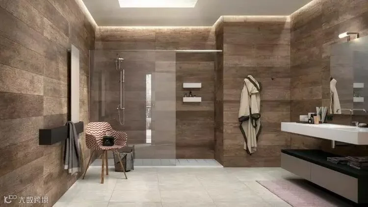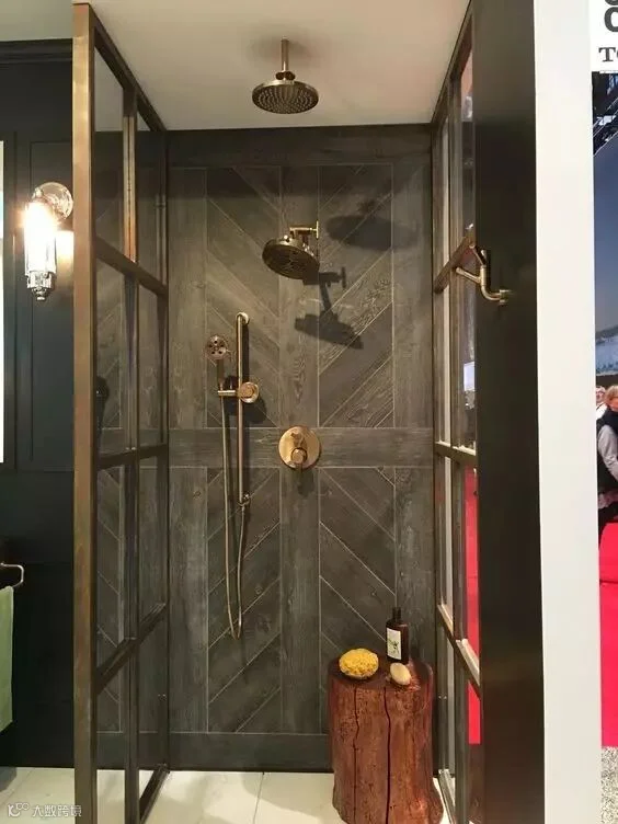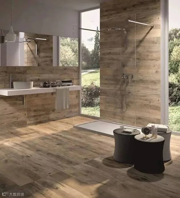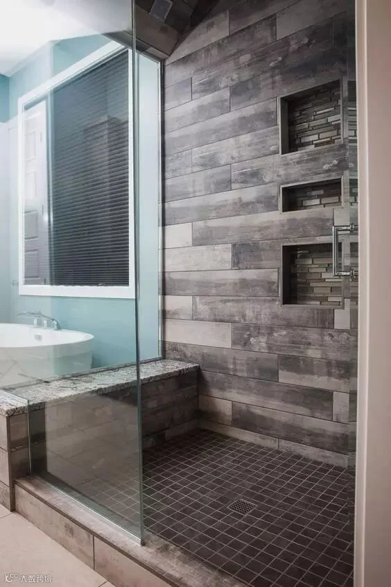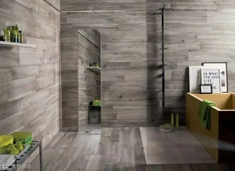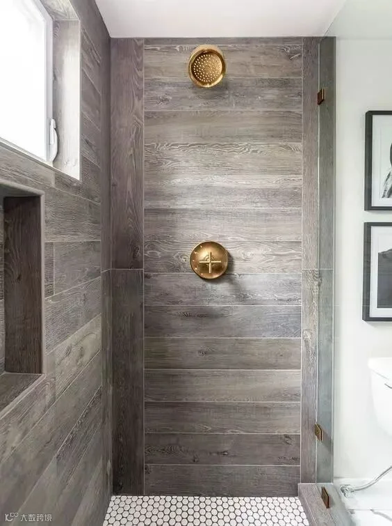 刚开始也只是部分地面通过不同铺贴方式把木纹砖和大理石、仿古砖、马赛克进行混搭铺贴,现在为了让整个浴室更好打理、更能展示原始大自然带来的舒适感,国外家装开始流行在浴室进行大面积木纹砖铺贴,甚至淋浴房墙上也贴木纹砖!