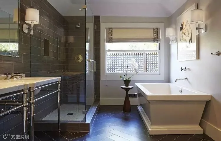 深色木纹砖给人复古、经典、端庄的感觉,把深色木纹砖运用到整个浴室空间,能够令人如置身雨林大自然,得到更好的放松。另外,浴室比较潮湿,容易产生水垢污渍,而深色瓷砖在这方便就更好打理。