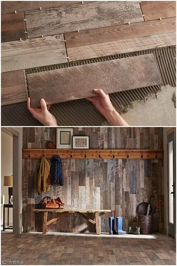目前,大部分的木纹砖都是铺贴在地面,鲜有上墙的。但国外已经开始流行把木纹砖从地面开始延伸到墙面,通过软装和家具搭配变成个性空间。