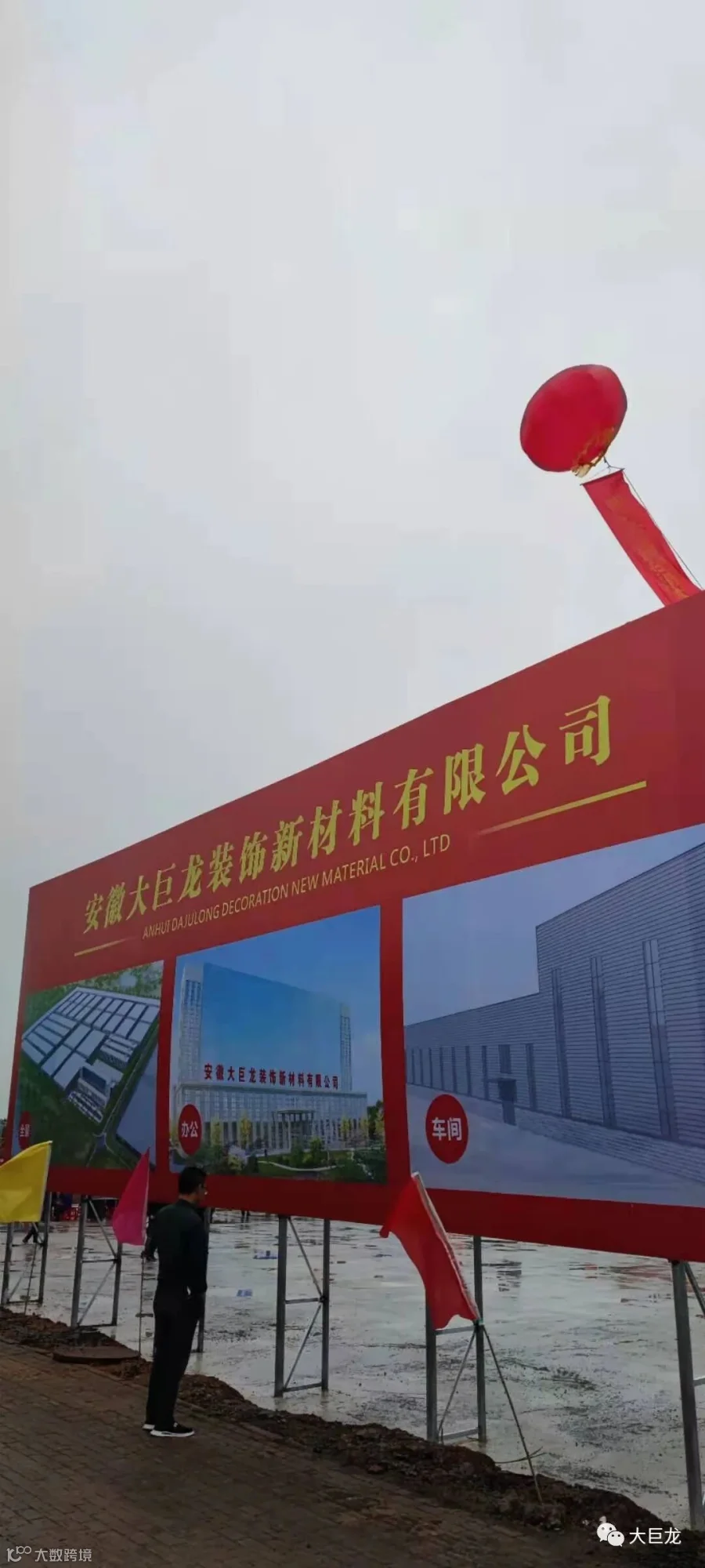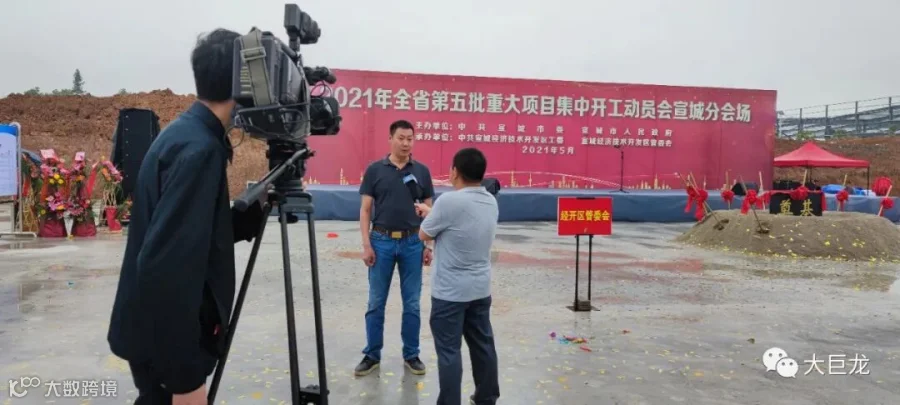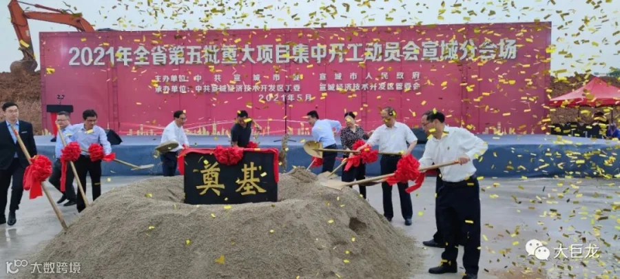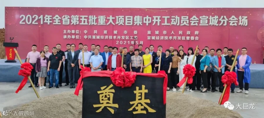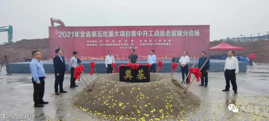 2021年5月26日上午8:18,安徽第五批重大项目集中开工动员会宣城分会场活动,在宣城经开区“安徽大巨龙装饰新材料有限公司”项目地块举行。大巨龙集团公司董事长李德荣、总经理李鑫和出席活动的宣城市级领导和代表为大巨龙新开工项目奠基培土。