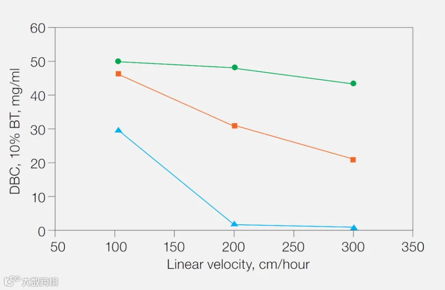图1. Dynamic binding capacity (DBC) vs. flow velocity of Nuvia IMAC Resin: