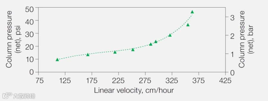 工业化生产中,高流速常伴随柱压升高,可能导致填料压缩、流速受限,影响生产效率。Nuvia IMAC凭借优化的粒径分布(38-53µm)和1.2-1.25的低压缩因子,在20×20cm的层析柱中,流速达300cm/hr时柱压仍低于2bar,彻底摆脱了 “高流速 -高柱压” 的瓶颈,为规模化生产提供了稳定的操作窗口。