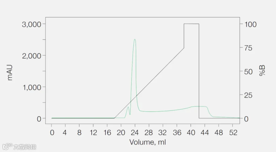 10mg of a 40kD histidine tagged protein were loaded onto a 1ml column of Nuvia IMAC (0.46x5cm) at a flow rate of 300cm/hr. The equilibration and post-loading wash was performed with buffer A (50mM sodium phosphate, 300mM NaCl, pH7.5). The elution was performed in 20CV linear gradient with 0-75% buffer B (50mM sodium phosphate, 300mM NaCl, 1M imidazole, pH7.5) and then hold at 100%buffer B for 5CV.Recovery of target protein is 96.8%. A280 (—); %B (—).