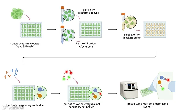 In-Cell Western(ICW)与传统WB方法不同,其使用固定和透化的细胞而不是细胞裂解物对蛋白质表达进行原位分析。并且可以使用光谱不同的荧光染料对多个目标进行定量,是一种确定大量样品中相对蛋白质水平的快速方法。对于已经使用传统WB已经验证过抗体特异性且不需要考虑分子量的研究人员来说,ICW 是一种理想的实验方案选择。作为一种免疫荧光检测,ICW结合了传统WB的特异性与免疫荧光、ELISA 的更高重现性及通量,可对6 ~ 384 个孔的微孔板中生长的细胞中进行蛋白表达分析。