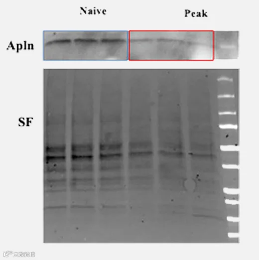 Western Blot检测apelin蛋白的表达水平。以Stain-Free(SF)免染总蛋白作为内参,替代传统的看家蛋白。