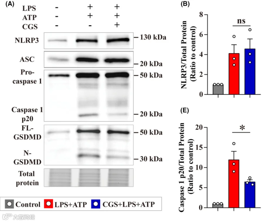 Western Blot定量各关键蛋白的表达,Stain-Free免染总蛋白作为内参上样控制。A2AR 激动剂抑制pro-caspase 1和FL-GSDMD的剪切体