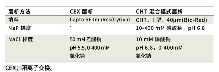 1 聚集体去除:CHT不管是氯化钠洗脱还是磷酸钠梯度洗脱,对于聚集体去除效果都优于CEX。
