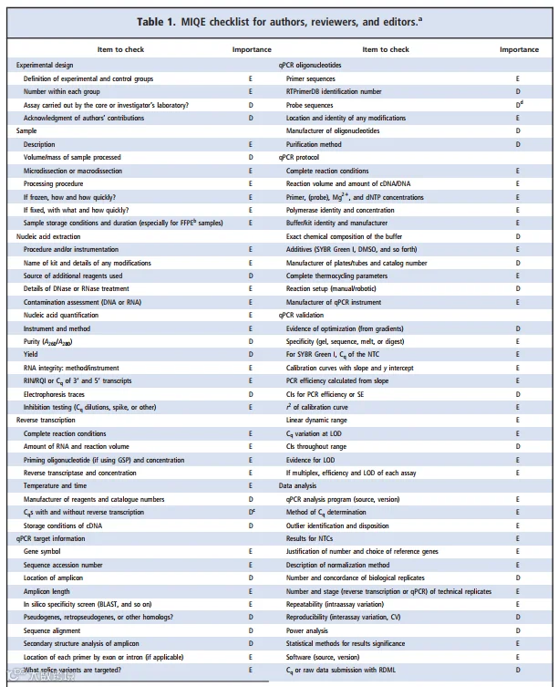 MIQE 是国际上最新推出的一套指南,就评价RT-PCR(qPCR)实验和发表文章时所必需的实验信息提出了最低限度的标准(即那些必需的实验信息),不仅面向作者,同时审核人和编辑也应该参考该指南。MIQE 指南是文章投稿时需要同时提交的一个实验清单(🔗文末扫码以获得 MIQE 指南原文及Checklist)。通过论文作者提供相关的实验相条件和实验特点,审稿人可以评价实验所用方法的可靠性,另外提供详细的实验所用试剂、序列和分析方法,以保证其他研究人员可以利用这些信息进重现实验结果,qPCR 实验必须报告这些信息,以确保其相关性、准确性、正确解释和可重复性。MIQE 的细节应当作为在线发表的一个附件或者简要形式同时发表。