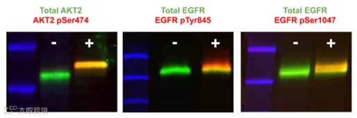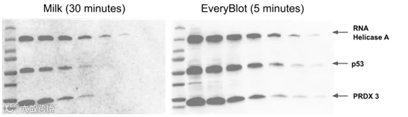 不能使用常规的脱脂奶粉做封闭,因为奶粉中有大量的磷酸化酪蛋白,从而影响磷酸化抗体对靶蛋白的结合。这个是我用 EveryBlot 做的磷酸化蛋白图,效果真不错!