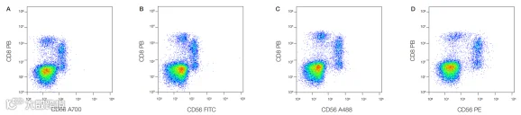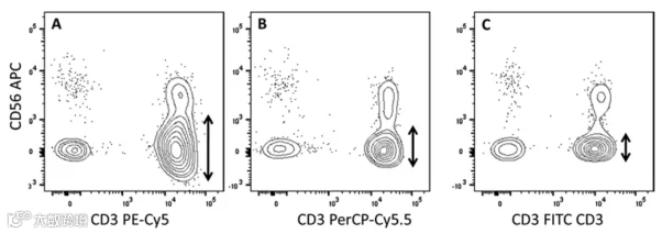 随着多色流式中使用染料数量的增加,这种现象会更加明显。尤其是鉴定细胞上共同表达的两个指标时,细胞亚群会出现分辨率降低的现象,甚至还会影响设门,引起误差较大的检测结果。因此,鉴定目标细胞群共同表达的指标时,应尽量搭配荧光干扰较少的荧光素。