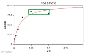 在使用抗体前,推荐进行浓度滴定。以此来确定最佳用量,帮助优化流式实验结果,也可以节省抗体。如下图中检测的CD8 SBV710,使用推荐用量的一半甚至四分之一便可以获得非常高的染色指数。