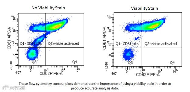 死细胞具有较高的自发荧光,会增加背景噪声。另外死细胞容易与抗体进行非特异性结合,造成假阳性,如图7所示在散点图的45°角可以明显地观察到死细胞。