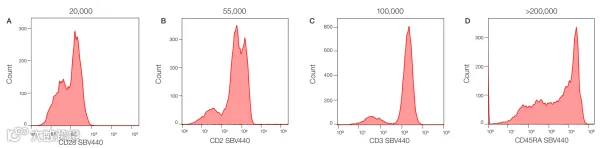 图2 用相同荧光素SBV440标记不同抗原(CD28,CD2,CD3,CD45RA),抗原表达密度不同,染色表现各不相同
