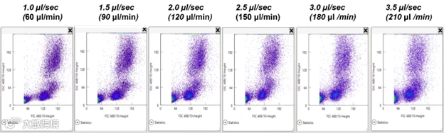 此外,分辨率对获得准确且漂亮的流式结果图意义重大。分辨率是指区分阴性群和阳性群的能力,其取决于仪器及染料的兼容性和门控。ZE5有较高的分辨率,即使在高达3.5 μl/s的流速下,都能保持较高的分辨率。