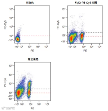 图9 多色流式细胞术的点图显示,与未染色的对照相比,荧光扩散到 FMO对照显示的 PE-Cy5 通道中。黑色虚线表示 FMO 门控边界,而红色虚线表示未染色边界。