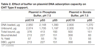 对于不同的结合 Buffer,也会导致 CHTII 对质粒的吸附。使用 20mM pH7.5 的磷酸钠和 pH7.5 的硼酸溶液进行测试,会发现硼酸缓冲液导致了 pUC19 的结合升高,但是 PS5 的下降。暗示较小的质粒采用硼酸缓冲体系可能会对结合以及产量有帮助。